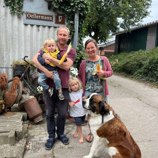Wir sind ein kleinbäuerlicher Familienbetrieb mit Mutterkühen und Ackerbau. Die Tiere weiden ab dem Frühjahr draußen. Auf unseren Feldern wachsen Getreide, Mais, Klee und Bohnen. Die Hofstelle ist sehr divers mit einem großen Baumbestand, vielen Blumenbeeten und Gräben, Hund, Katze, Hühner - alles, was dazu gehört.
